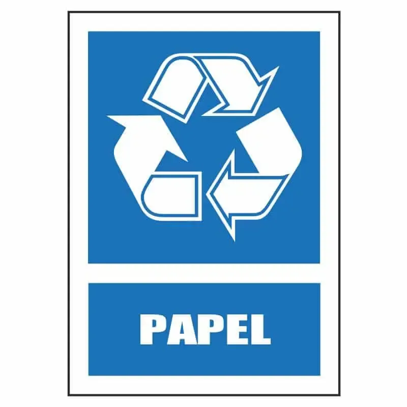 Cartel de reciclaje de papel para instalarse en contenedores, basureros, papeleras u otros lugares destinados al reciclado.