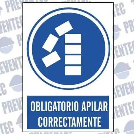 Señales de seguridad de obligación en el que se informa a los operarios de que es obligado apilar cajas correctamente para evitar accidentes provocadas por caída de cajas o obstrucciones que dificulten el trabajo.