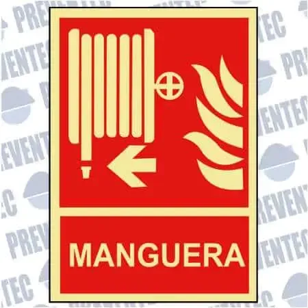 Esta señal de socorro nos indica la dirección ( hacia la izquierda ) en donde está ubicada una manguera para incendios para ser utilizada en caso de emergencia. Las mangueras sirven para transportar agua desde el punto inicial hasta el lugar en donde está el fuego.