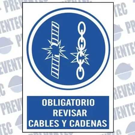 Señales de seguridad de obligación que nos informa de la obligación de revisar previamente los cables y cadenas para observar que no hay defectos.