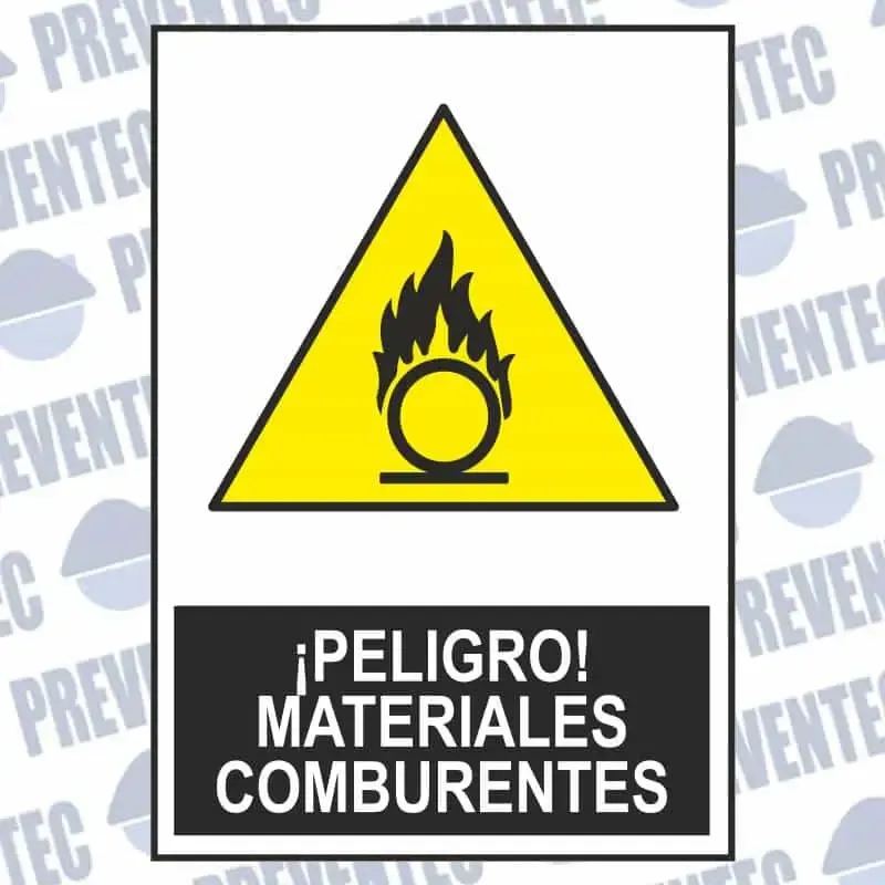 Esta señal de seguridad nos advierte del peligro a estar expuestos a materiales comburentes que puedan provocar una combustión y tener un accidente laboral.