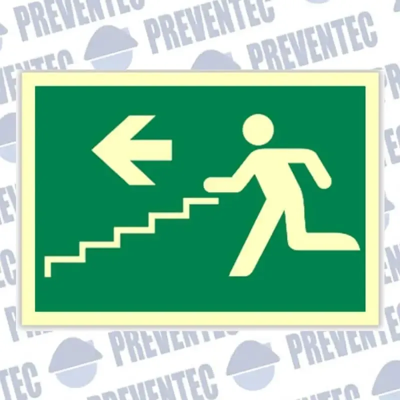 Esta señal nos informa que en caso de emergencia en nuestro camino de evacuación de un local nos vamos a encontrar con unas escaleras a nuestra izquierda que debemos de bajar.