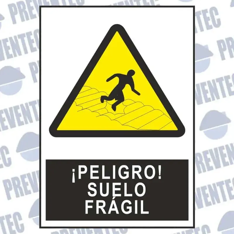 Señales de seguridad de advertencia homologadas para centros de trabajo con indicación de peligro por haber un suelo frágil.