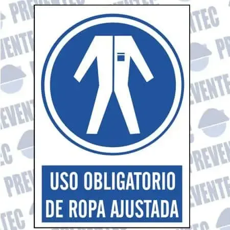 Señales de seguridad de riesgos laborales de obligación en la que nos indica que se debe de llevar obligatoriamente ropa ajustada para evitar enganchones en maquinaria principalmente.