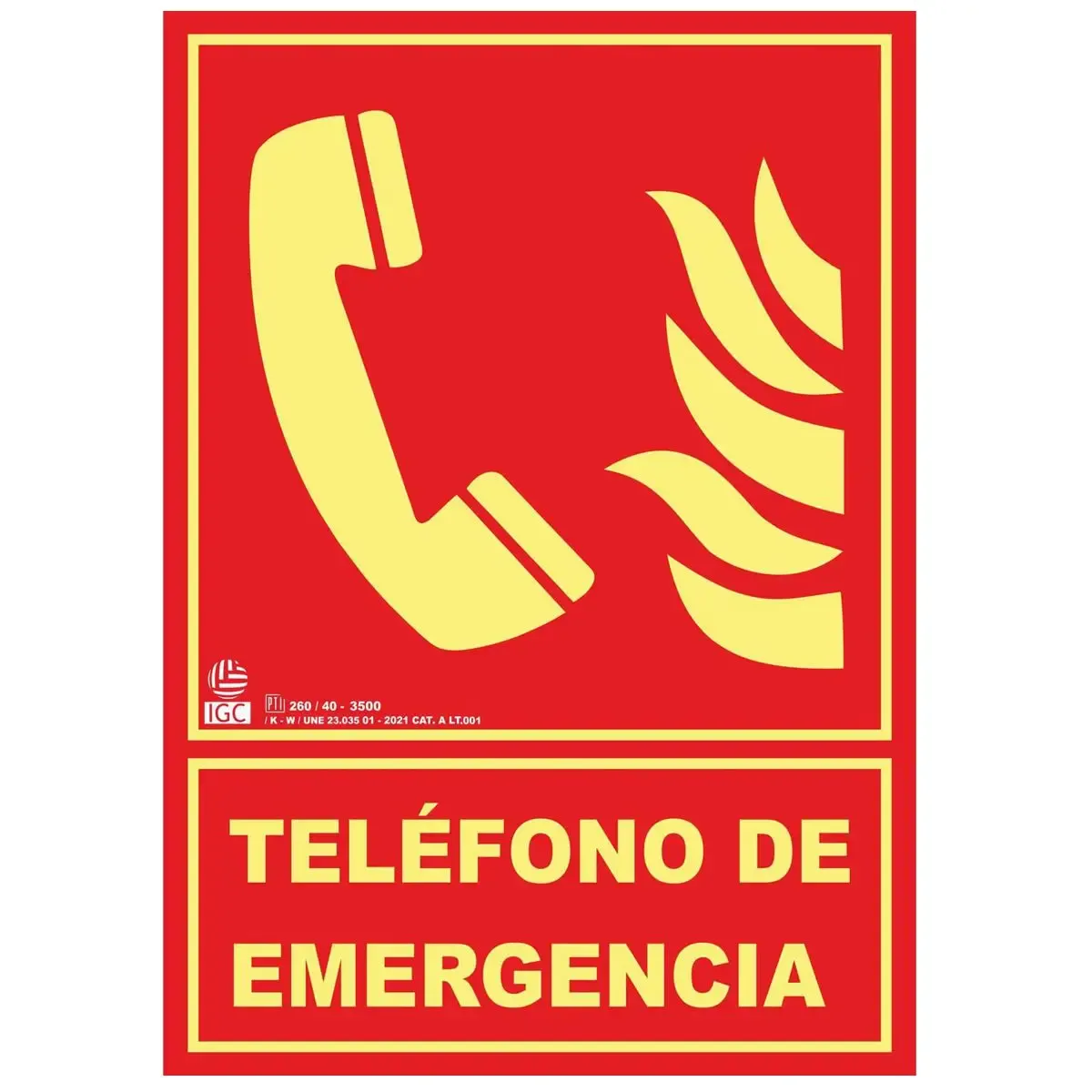 Señal de teléfono de emergencia fabricada en material PVC con material fotoluminiscente de CLASE A y CLASE B con tamaño de DIN A4 o A2
