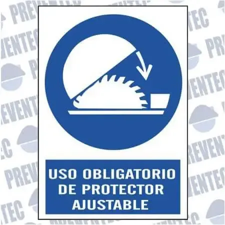 Señales de seguridad en el trabajo de obligación en el que se obliga a utilizar protectores ajustables en maquinaria para evitar el contacto directo del operario con la parte giratoria de la máquina.