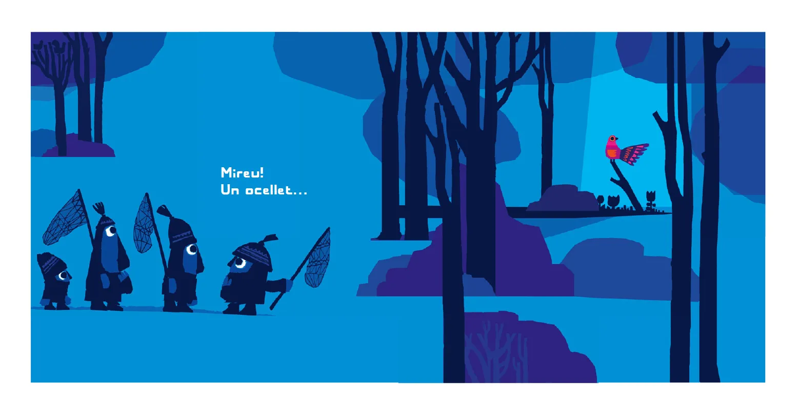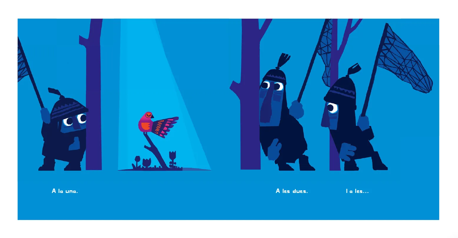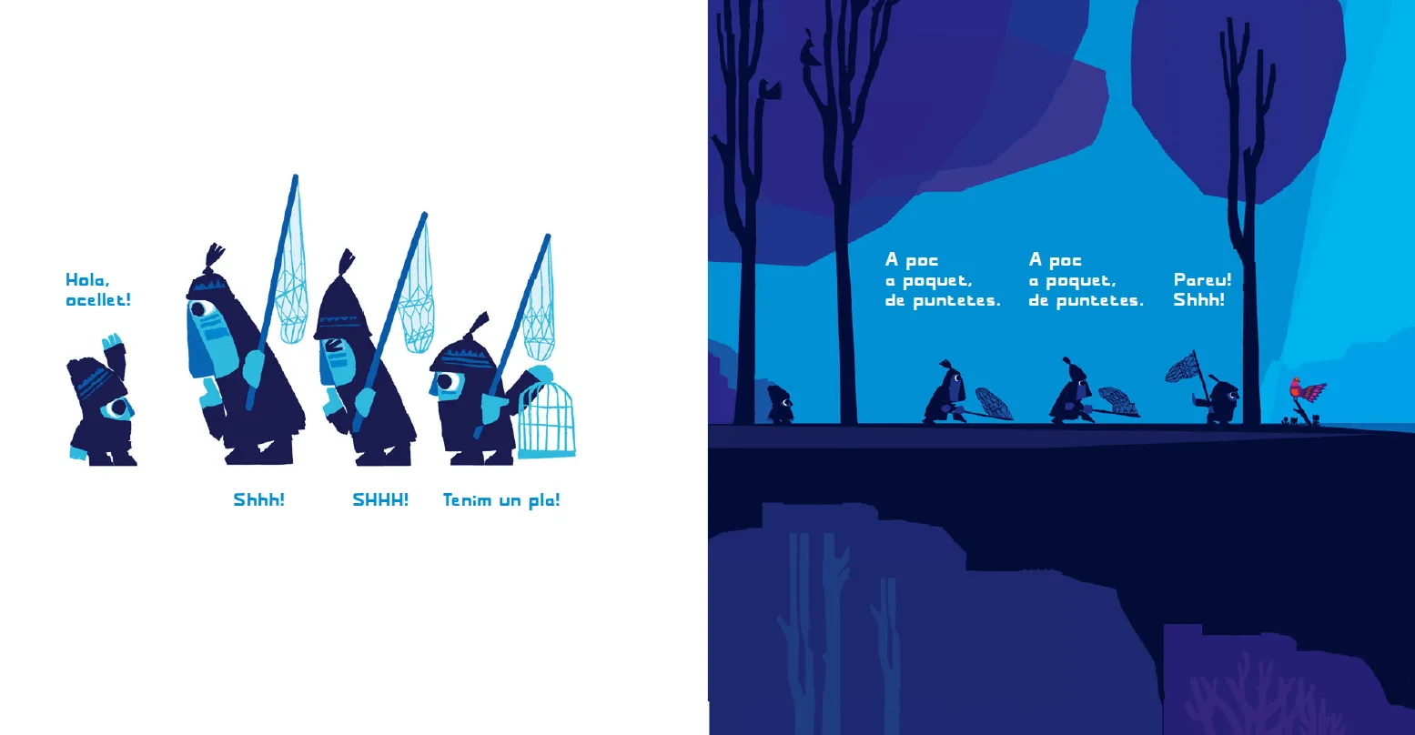Quatre personatges caminen pel bosc amb un caçapapallones. Quan veuen un ocellet, es comencen a moure sense fer soroll. Shhh! Tenim un pla!