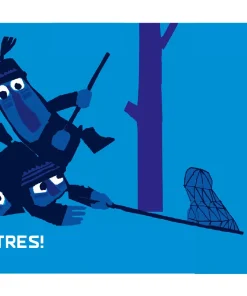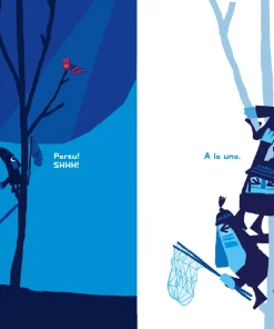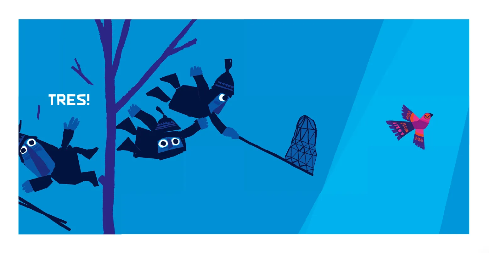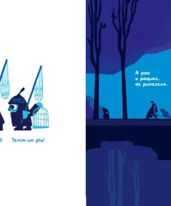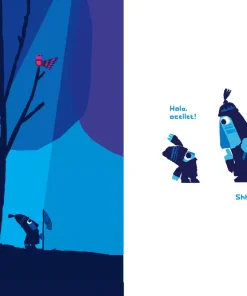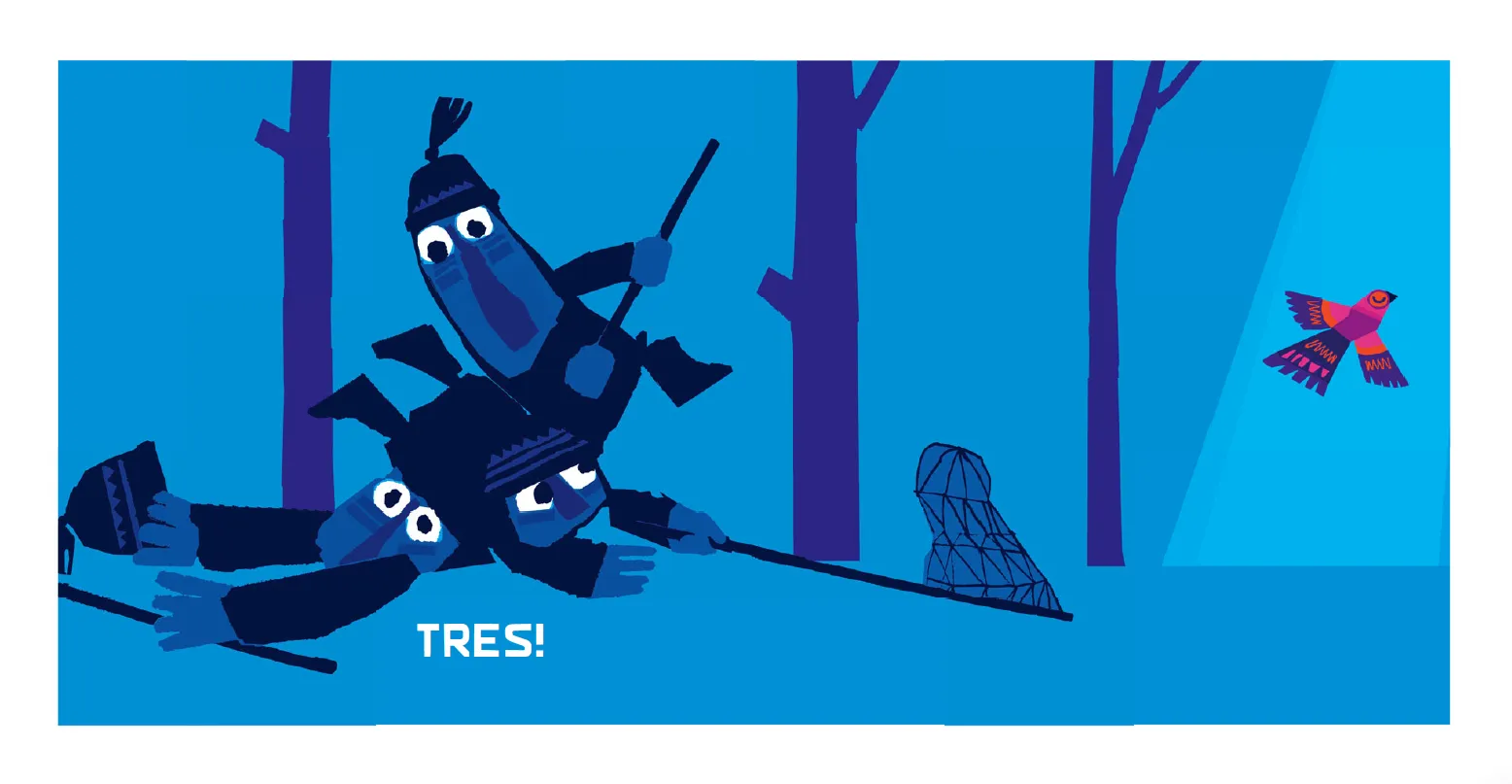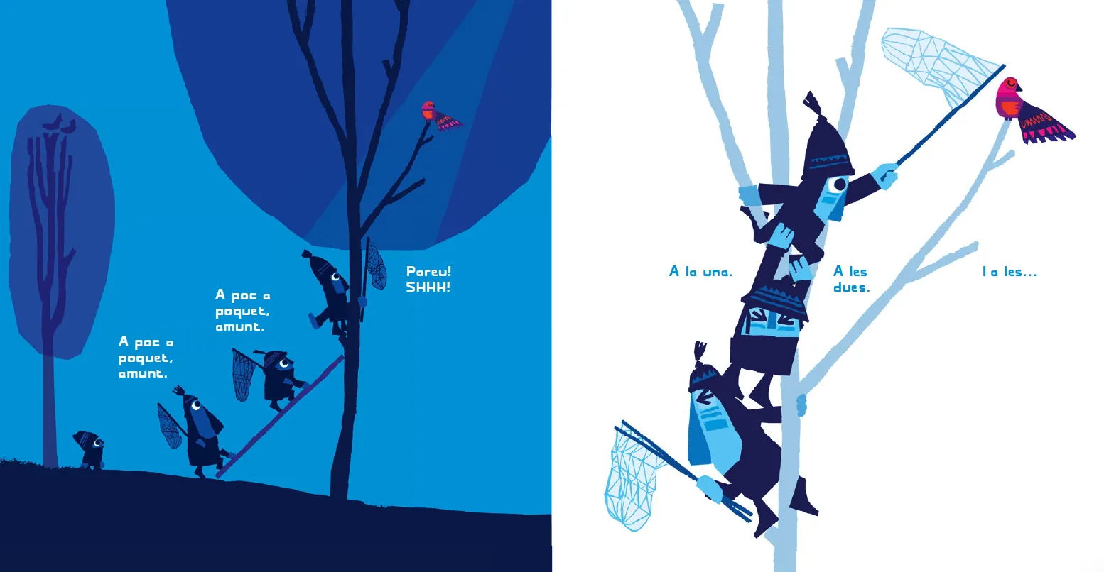 Quatre personatges caminen pel bosc amb un caçapapallones. Quan veuen un ocellet, es comencen a moure sense fer soroll. Shhh! Tenim un pla!