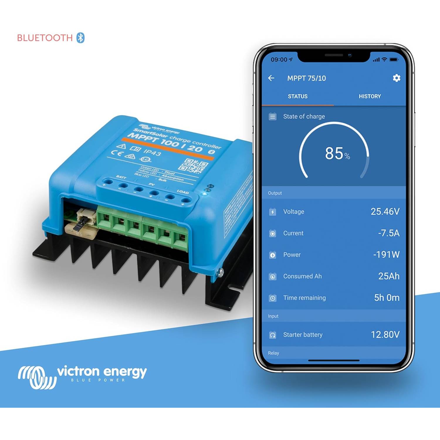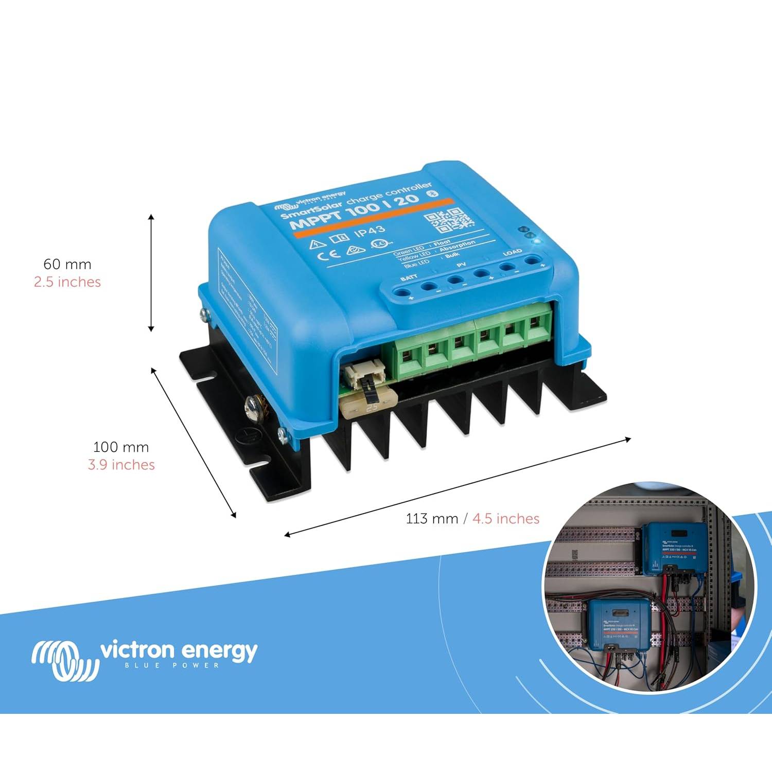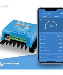 El SmartSolar MPPT 100/20 Victron recogen energía de la placa solar / panel solar y la almacena en su batería. Utiliza la tecnología más rápida y novedosa, gestionándola de forma inteligente para alcanzar la carga máxima en el menor tiempo posible.