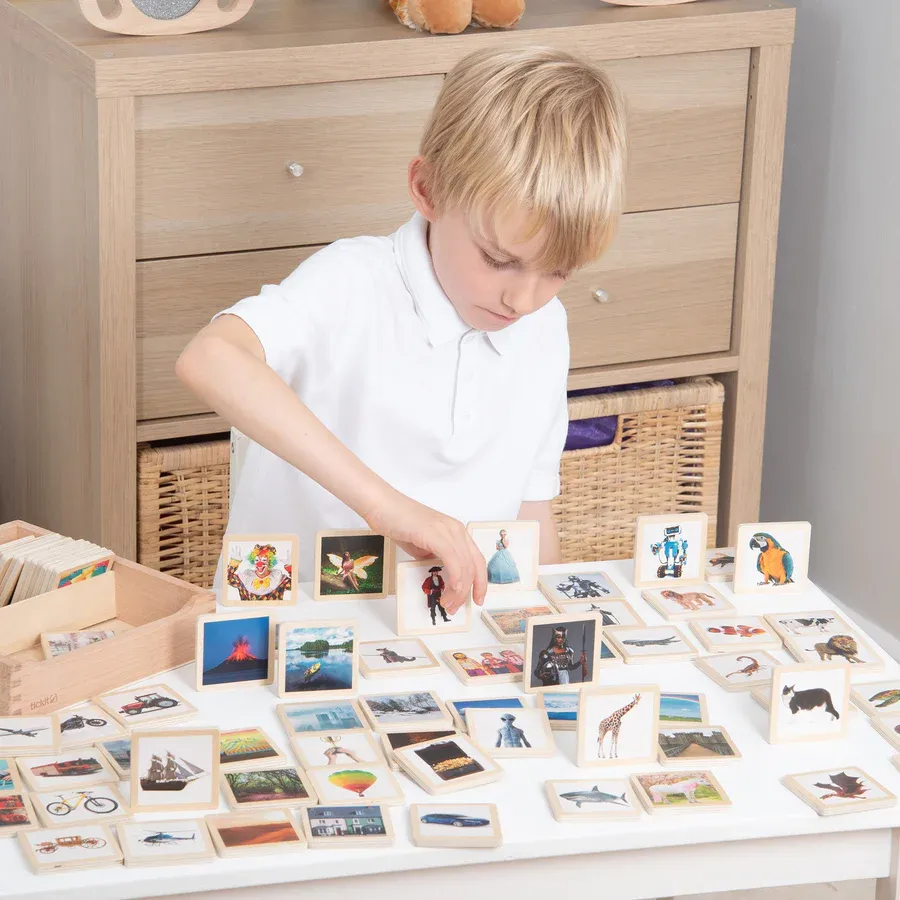 Desata la creatividad y despierta la curiosidad con este extenso conjunto de fichas de madera, que presenta imágenes vibrantes y realistas diseñadas para inspirar la narración de historias y el juego imaginativo. Este recurso atractivo es perfecto para fomentar el desarrollo del lenguaje, el pensamiento creativo y una comprensión más profunda del mundo.