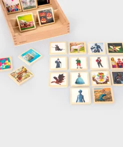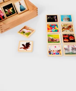 El conjunto incluye 90 fichas de madera duraderas con imágenes fotográficas de una variedad de categorías: animales, personajes, lugares, modos de transporte, celebraciones, clima y objetos fascinantes. Los niños pueden seleccionar fichas por categoría para crear oraciones descriptivas utilizando adjetivos y palabras de enlace o elegir fichas al azar para crear secuencias divertidas e historias entretenidas. Para los niños mayores, las fichas se pueden usar para un juego de creación de frases: darlas vuelta, elegir tres al azar y contar una historia utilizando las tres imágenes, incorporando verbos, adverbios y adjetivos.