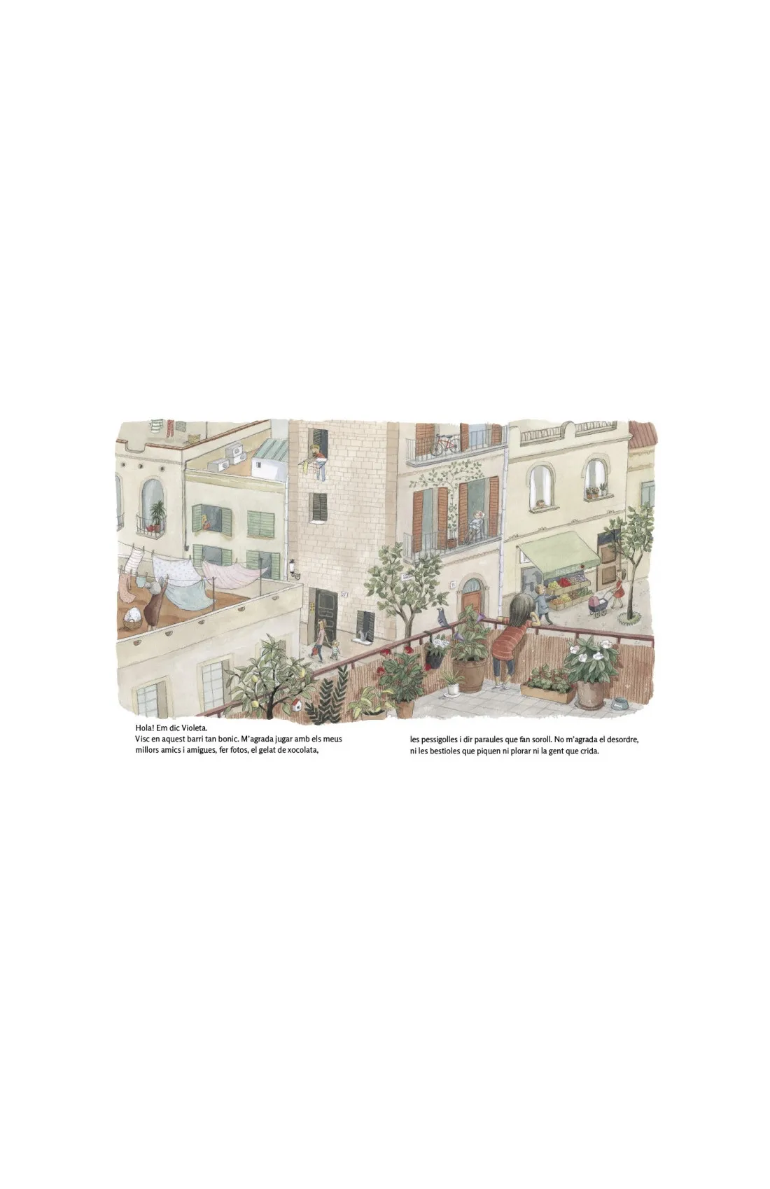 ¡Hola! Sóc la Violeta. Tinc un gos juganer que es diu Raspall. Amb els meus amics i amigues estem preparant una festa al barri. Aquí hi viuen famílies ben diferents. Però una cosa ens fa iguals: tots ens ajudem i ens estimem. Som una gran família! Ens hi acompanyes?