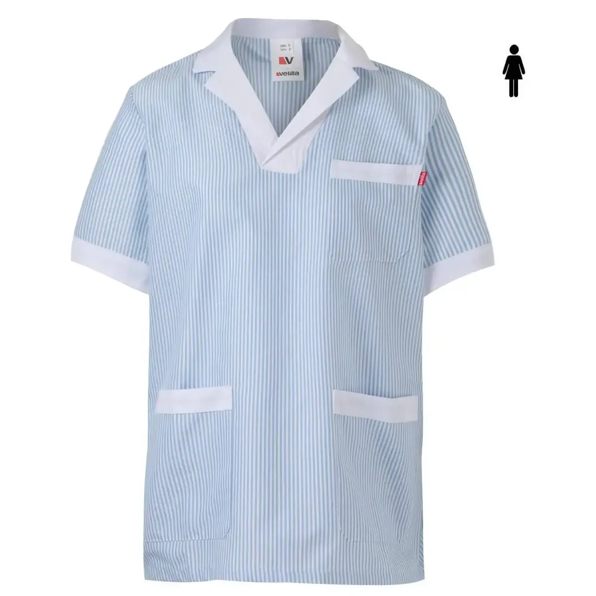 Este uniforme limpieza mujer del fabricante Velilla consiste en una chaqueta pijama con diseño entallado para mujer y vivos de contraste ideal para mujeres en trabajos de limpieza.