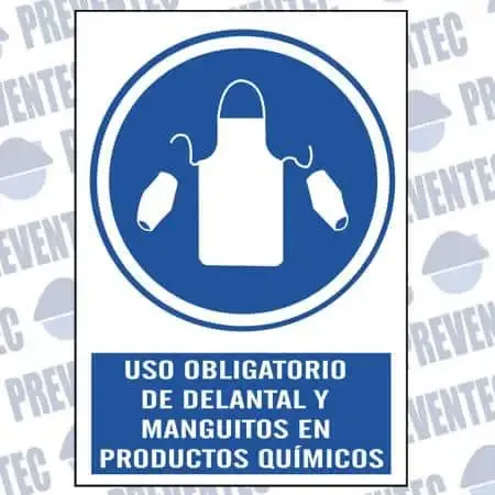 Señales de seguridad en el trabajo de uso obligatorio indicando que en trabajos donde se manipule productos químicos es obligatorio utilizar manguitos y delantales.